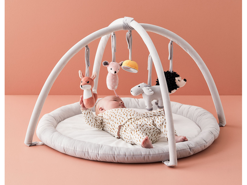 Mäkká polstrovaná hracia deka z plyšovej tkaniny patrí do série hračiek Edvin, inšpirované škandinávskou prírodou a zvieratami, ktoré v nej žijú. Okrem zavesených hrkajúcich zvieratiek pozornosť dieťaťa zaujme aj bezpečné zrkadielko. Hračky sa ľahko upevňujú suchým zipsom.